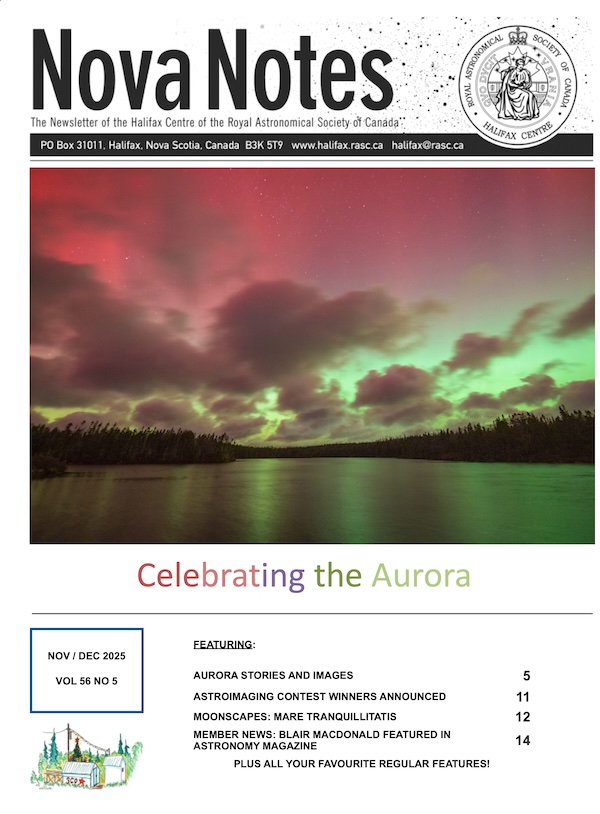 The Halifax Centre publishes a newsletter, Nova Notes, five times a year. It contains articles, meeting reports, astrophotographs and astro-sketches, and other Centre information. It is published online in colour.